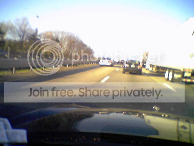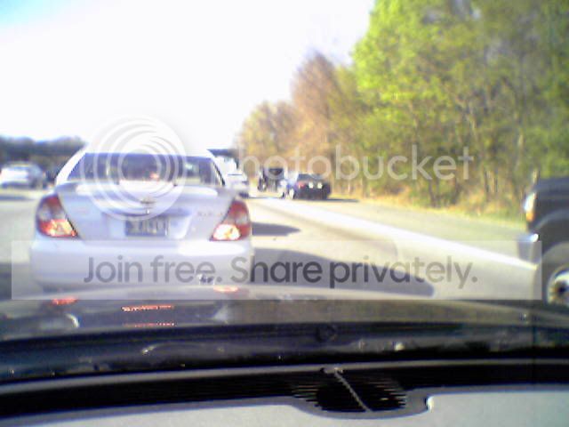 It seemed like it might be interesting, but it was probably just a mundane event. Unlike Thursday night last week. I had a date with Jen in Methuen. I left Framingham at 5:35ish. I got onto the Pike and hit major traffic. I got onto 128 and hit more major traffic. I usually get off 128 at route 3 North, but when I go to Methuen I stay on for another few miles (five or six maybe? Maybe a little more?) to route 93 North. About half way between 3 and 93 I was stopped in the left lane when not one but two cops came flying up behind me. One was a state cop, the other was a town cop. If you squint at this picture the cars in the left lane might almost register as cops. (yeah, I moved over one lane to let them pass.)