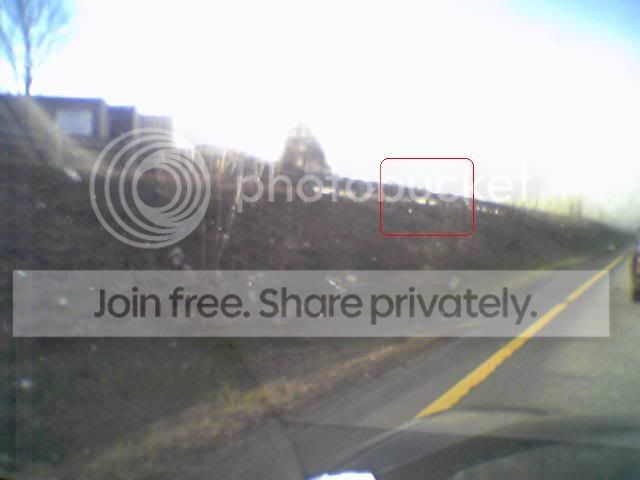 Can you see it now? Sure you can! I actually took two pictures, but the second one caught nothing but solar glare. All this camera phone action led me to dump all of the traffic pictures I’ve taken but haven’t used. There was a picture from the morning commute today too. A van was pulled over by a state cop. The driver of the van was unloading it’s contents onto the side of the road under the super vision of one of Mass Highway’s finest. At first I thought it was a bust, but it was probably just a break down and the driver was going to move the contents to another van.