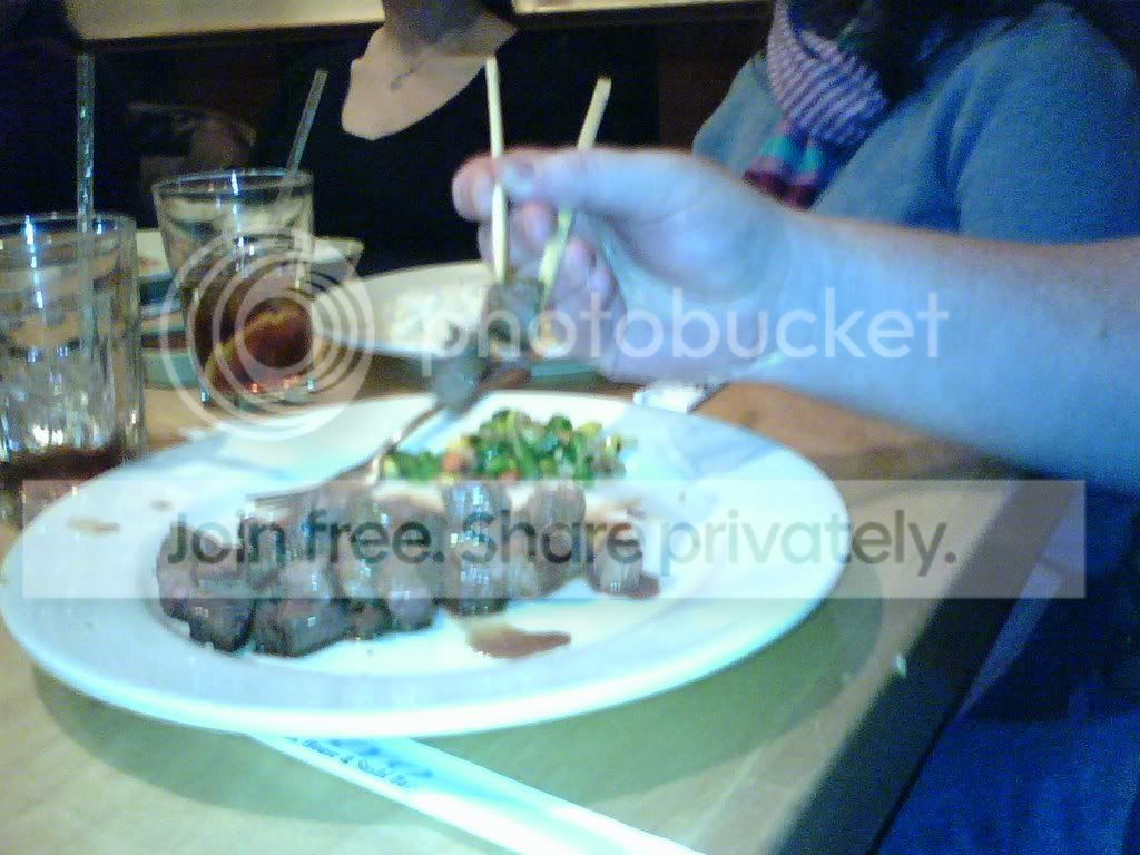 Yup, those are chopsticks holding a tasty piece of steak, and the hands holding said stick like eating utensils are mine…