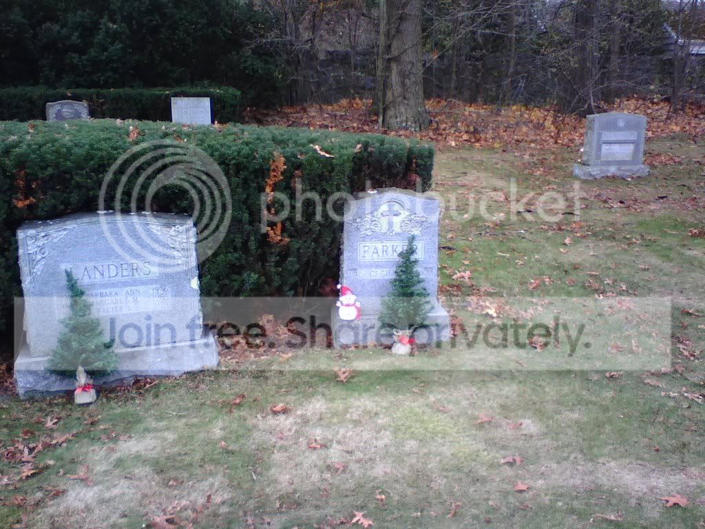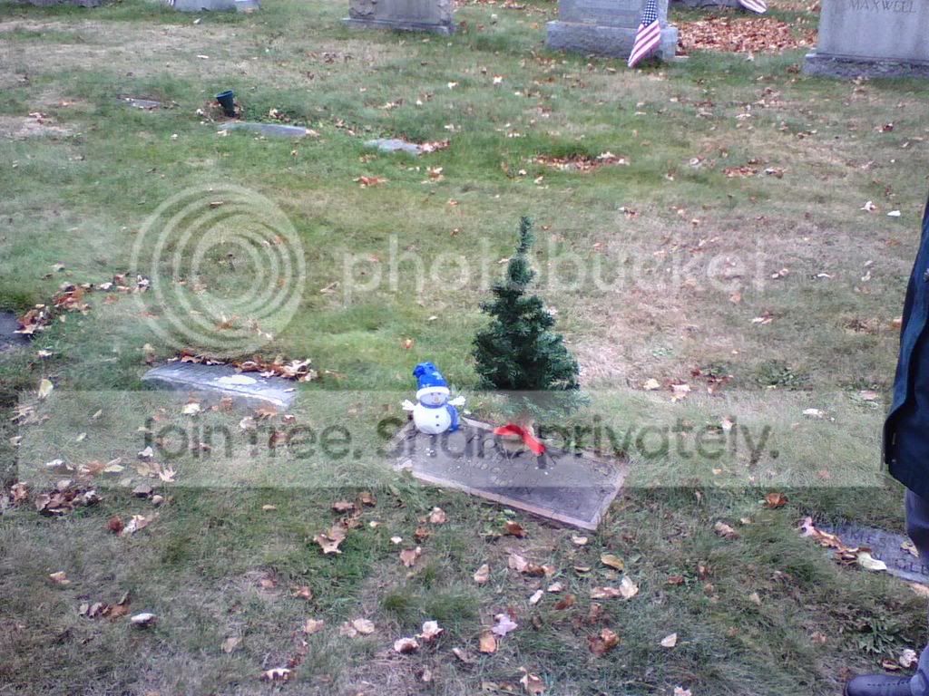 and yes that is me hamming it up as Jen photographed the momentous occasion of me eating stuff with two skinny pieces of wood. I have to admit that I used a fork to eat the fried rice, but I did managed to get some using the chopsticks before I gave up. *** Massive Change of Subject *** My grandmother died in 1997. Around the 1st anniversary of her passing me and a bunch of my close relatives went to visit her grave together, then we all went out to lunch together. As it turns out, my mother’s parents and my father’s mother, aunts and uncles, are all in the same cemetery. That allowed us to visit the graves of all of my grandparents (my father’s father doesn’t count. He split in 1950, never to be seen again, and when he died his ashes were spread out over a lake he used to fish in, some where in Utah or Oregon I think.). By a further coincidence, my father’s grandparents are also in the same cemetery. That innocuous little Sunday morning has turned into an annual event, with more and more people joining us each year. Due to the proximity of Christmas, one year my mother decided to leave little Christmas trees by the headstones. That too became a tradition. This year my mother left a little green (OK, it’s fake) tree at each headstone, and my cousin Erin left a little battery operated, light-up snowman for my grandparents. My cousin Tom took a picture of the Powers grave, which sort of opened the floodgates for me… if he’s gonna take a shot, then I’ma gonna take a shot too! We are all under the assumption that the trees and Mr Snowman probably would be gone by the time it got dark, but now we can all see what it looked like during this year’s (very insensitively titled… by my mother, I think) Dead Relatives Tour.