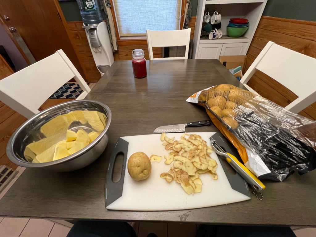 Peeling potatoes. If I was in the army this would be a sign that I was in trouble. Instead it just means we are having potatoes with dinner.