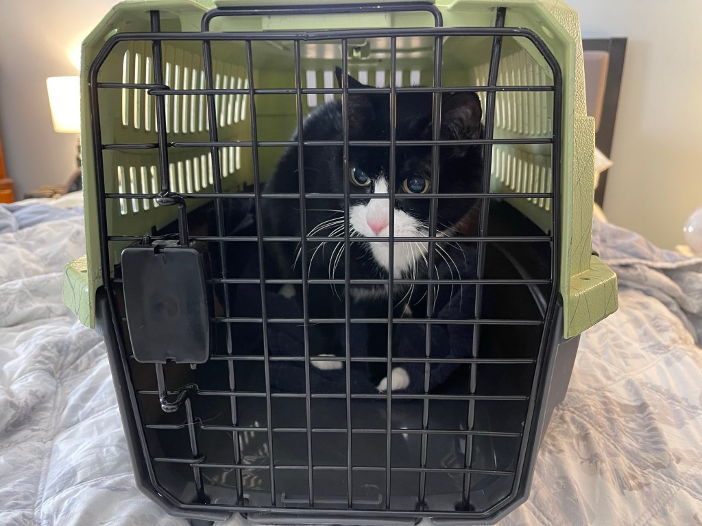 It usually takes an hour to get her into the carrier. Today it took two minutes. Now she’s packed up and we are crazy early. Shit.