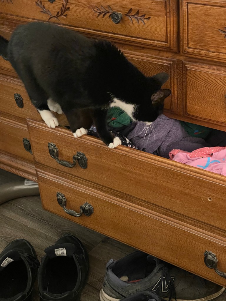 Jen purposely left her PJ’s drawer open in the hopes that Patches would go exploring. She did.