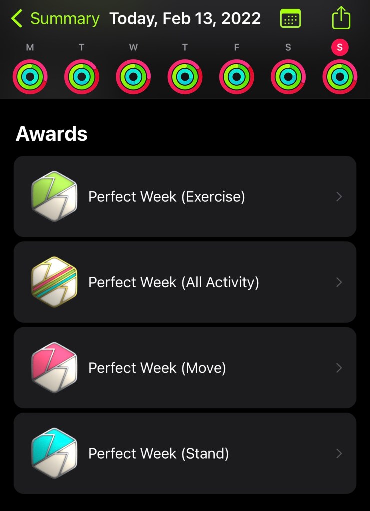 Perfect Week Stand. Perfect Week Exercise. Perfect Week Move. Perfect Week All Activities.