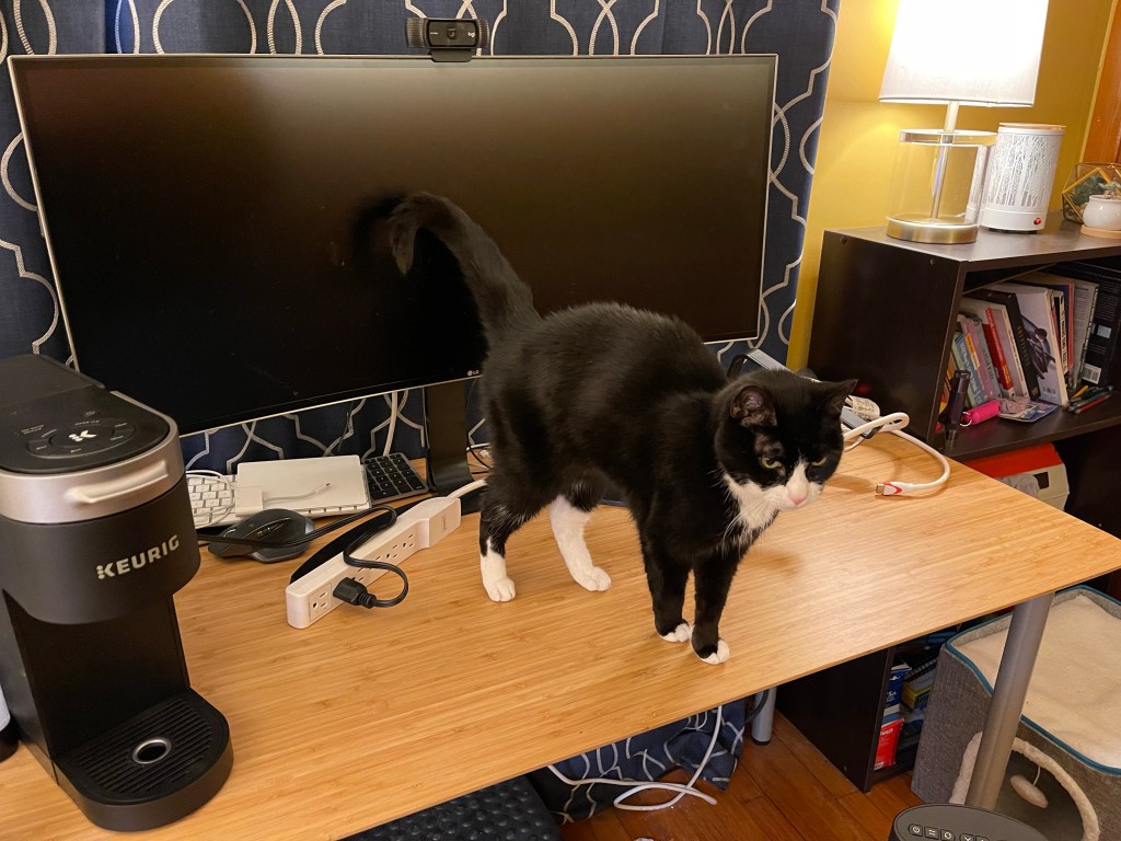 The coffee maker has been temporarily relocated during the kitchen remodel fun. The cat doesn’t quite know how to feel about it.