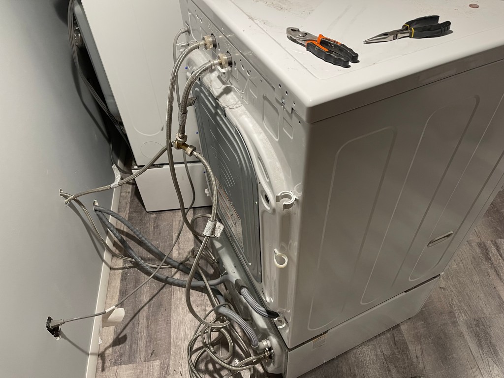 So job #1 today was reconnecting everything. There are actually two washers. The main one and the little tiny quickly one it sits on. When I unhooked it I undid two outflow pipes and two inflow lines. The inflow lines each go through a splitter to the two machines but I left those in place.