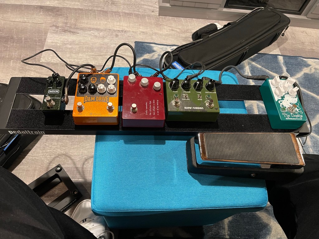 I’ll take the Mooer E-Lady flanger off the big board, and the MXR Phase 95 that’s at Mike’s house and fill the space on the right. I’ll also take the MXR power brick on the board at Mike’s house and replace the daisy chained power supply.