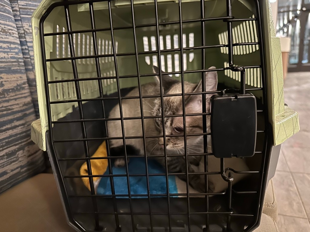 Less than 48 hours after adopting Miss Robin Sparkles, we are at the vet. She had an eye infection last week and it appears to have come roaring back. Poor little kitty.