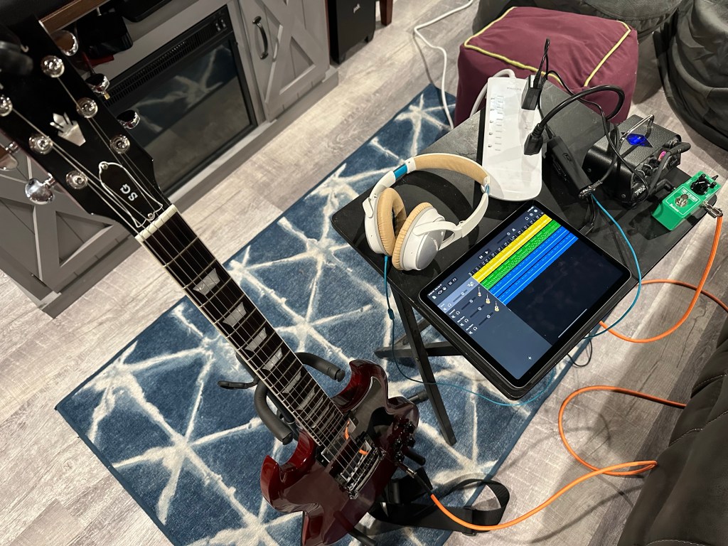 Gibson SG standard into Ibanez Tube Screamer Mini into Vox MV50 Clean into IK Multimedia iRig split into iPad Air running GarageBand and an old pair of Bose headphones.