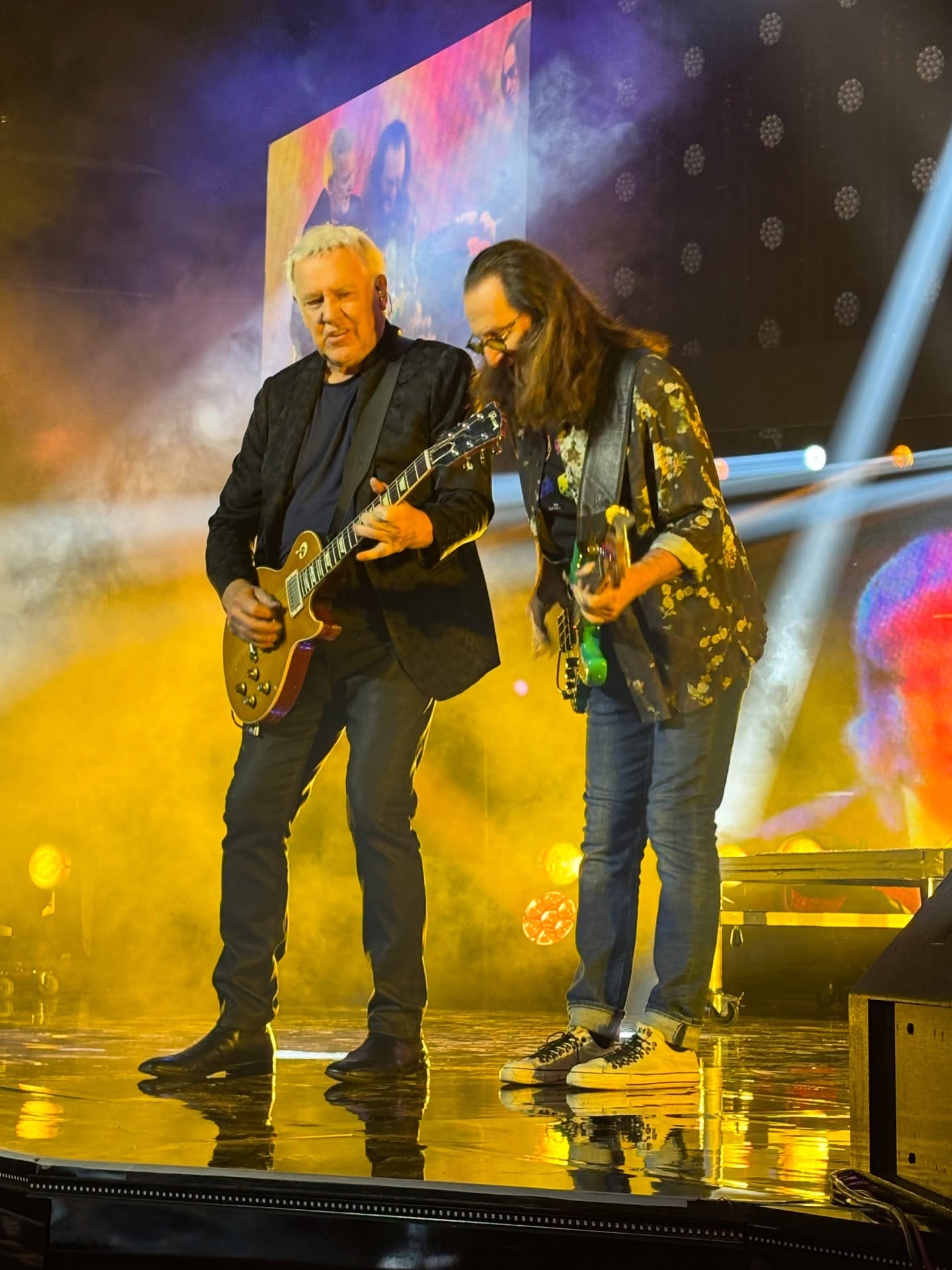 It looked like a vintage burst. Something made between 1958 and 1960. It was faded from sunburst to yellow the way a lot of ‘58’s and ‘59’s are. I assumed it was the real deal, but I don’t think I’ve ever seen Alex play a real burst before. I know Geddy Lee owns (owned?) one, but Alex usually plays newer models. Even back in the 70’s, before vintage Les Pauls became too enormously expensive, he played 70’s models.