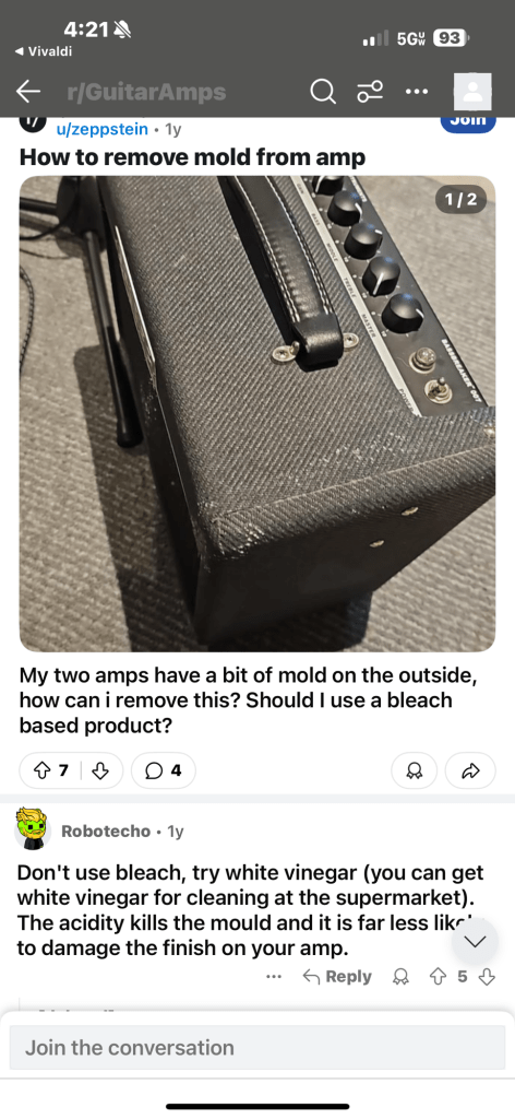 I found a post on reddit that suggested using white vinegar to clean off whatever that mold looking shit is. I guess mold growing on tweed amps is a thing? I’ll share a screen shot of the post here: