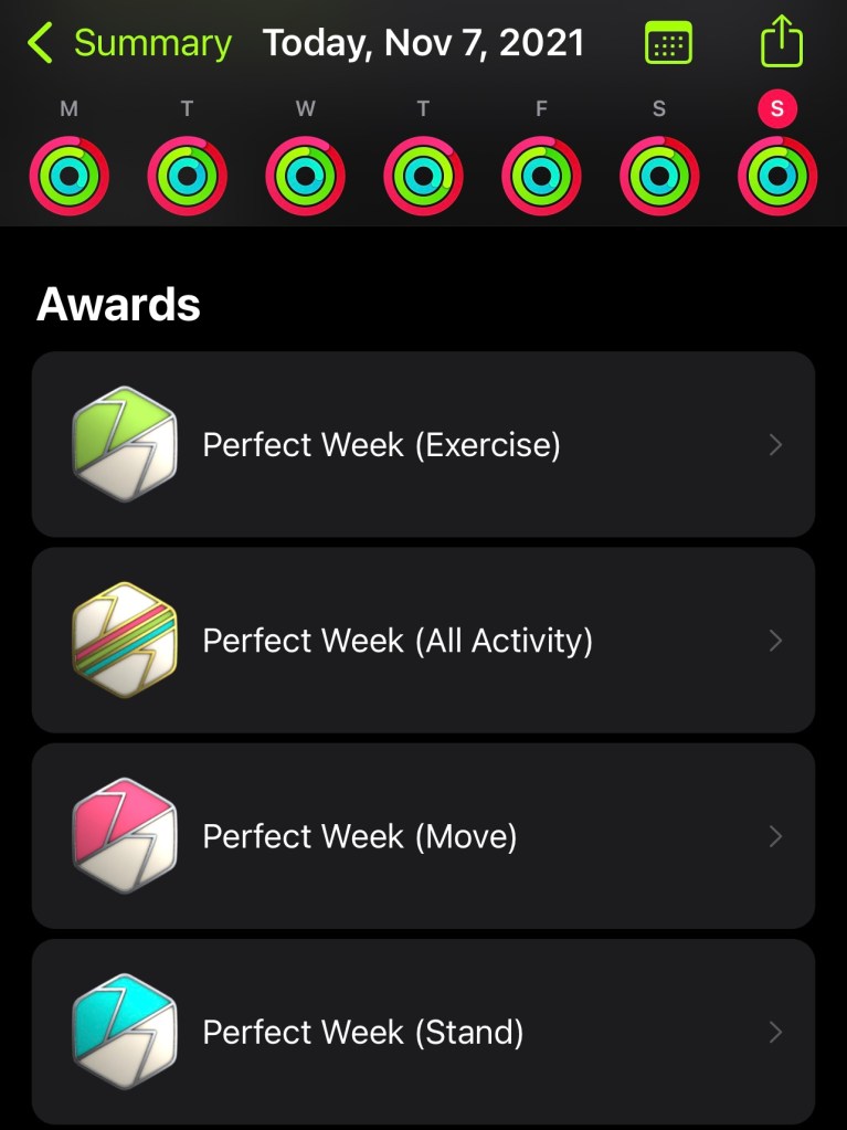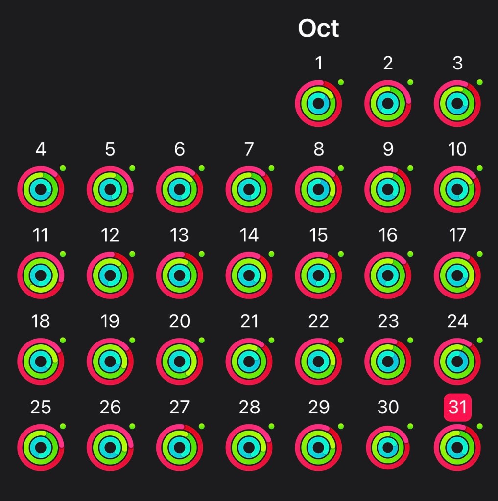 My success streak had come to an end, and over the next two days we were going to be in the car all day. I made the choice to just not worry about it until we got home. Then when we got home I was so out of sorts that I decided to take the weekend off too. Well, the weekend is over. It’s 6:48am and my exercise ring is closed. I jogged (pronounced “yog”, with a soft “J”) in place for 31.5 minutes which closed the exercise ring and 64% of the move ring. I plan to start lifting the hand weights a little again today too. I fell off that wagon months ago and it’s time to start that up again.