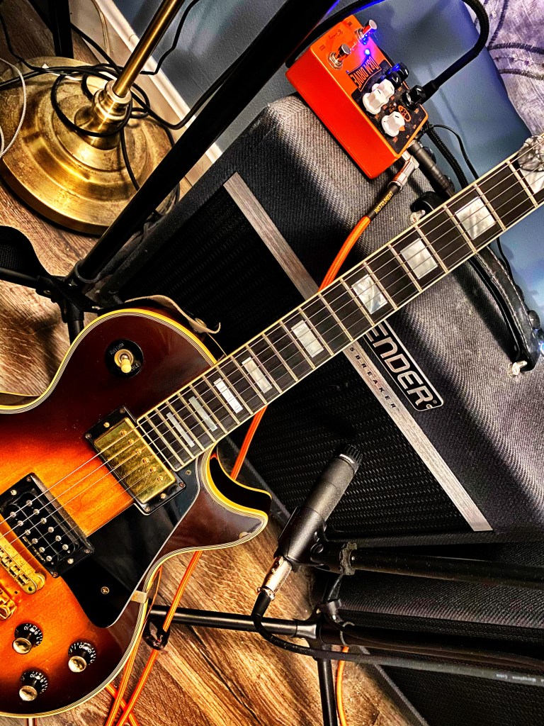 So the rule for April is rhythm guitar is my SG with the boost side of the D&M Drive. Leads are the Les Paul through the drive side of the D&M Drive.