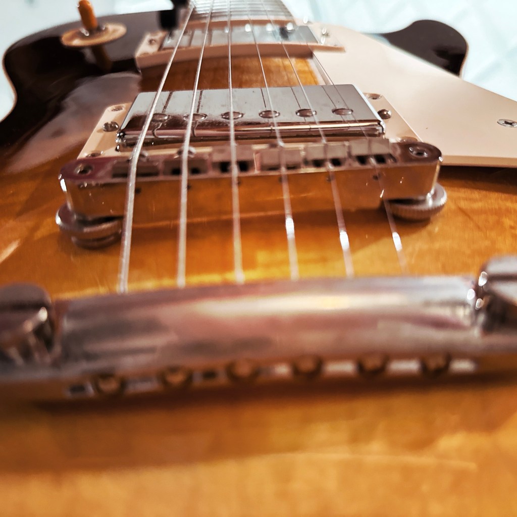 Note the guitar case in the blurry background. That’s my other Les Paul. The one Jen got me for my 50th birthday. I’ll be swapping them out the next time I record guitars. The birthday Les Paul is the only one of my electric guitars that hasn’t made it onto a 50/90 track yet. That will change, probably tomorrow morning.
