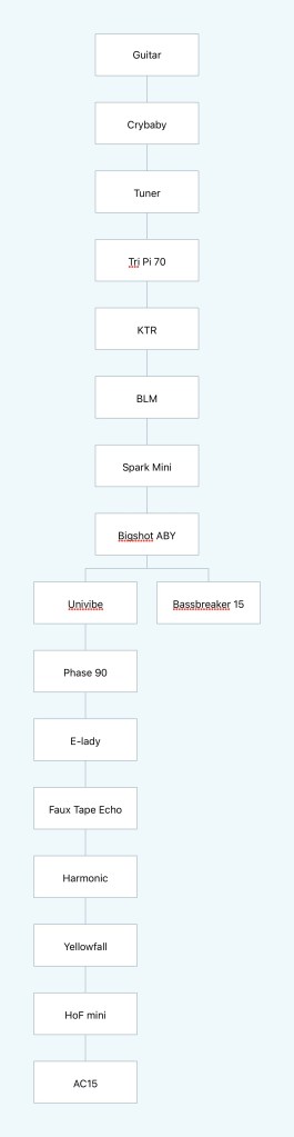 I used my full pedal board tonight so I’ve been getting goofy with all of the toys. I used a fuzz pedal tonight, and the uni-vibe pedal and a flanger and lots of wah wah. Goofy, but fun. Just feeling good about my hand not sabotaging me. Like, whew, am I right?