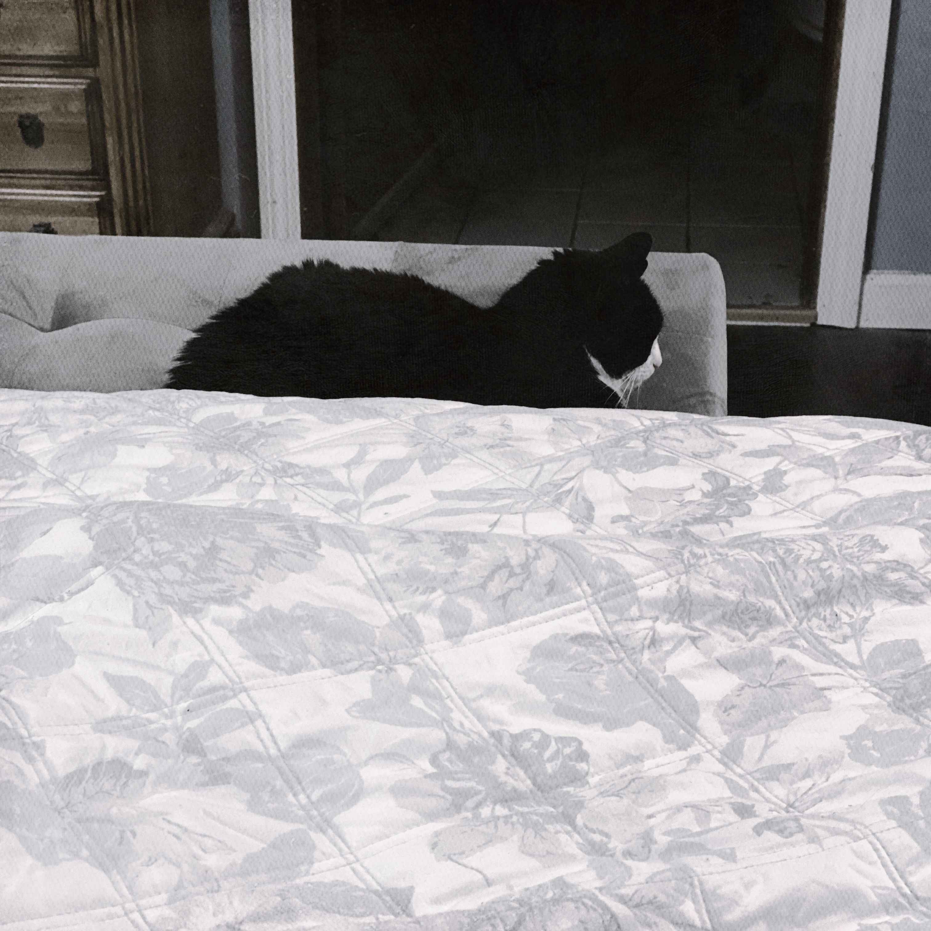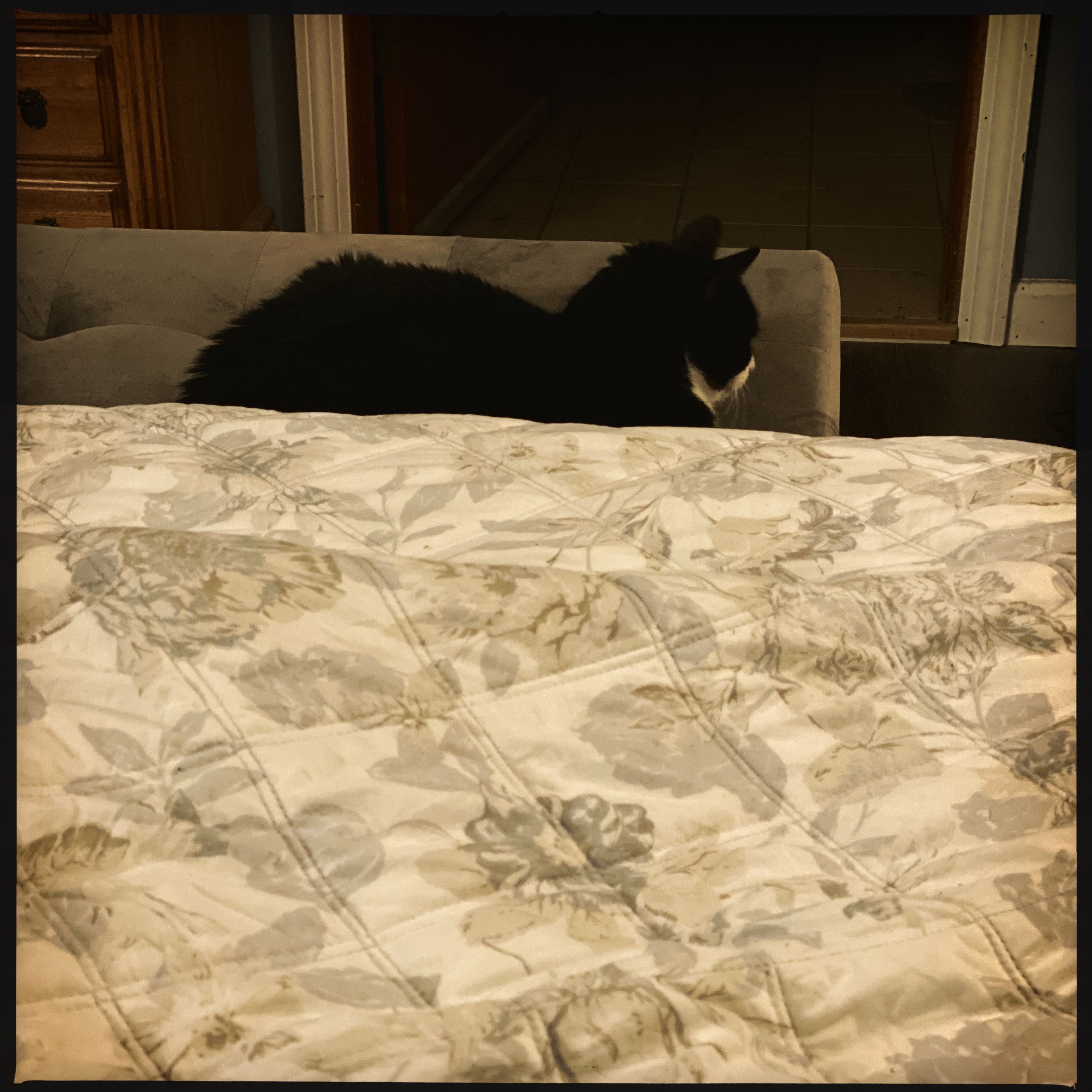 She’s sitting on the bench at the end of the bed, just being too cool for school.