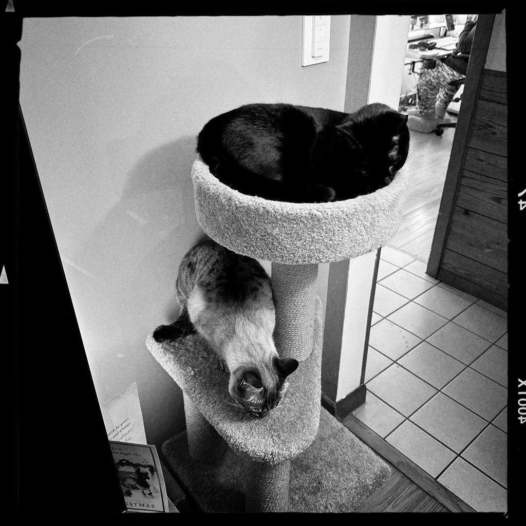 We had to move the cat tree to a new location. Lily seems fine with it. Robin seems concerned.