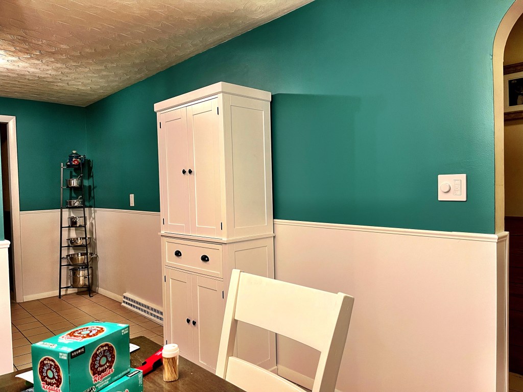 So far everything looks great. We are both really thrilled. I keep saying this to anyone who will listen, but when we moved into the house in 2010 I said the first thing we needed to upgrade was the walls in the dining room and the kitchen. The paneling and the wallpaper border had to go. 12 years, a redone bathroom, and a garage turned into a bedroom suite, not to mention new furniture and floor plans in literally every room in the house, and we finally get to the paneling and the wallpaper border. I gotta say, it feels great.