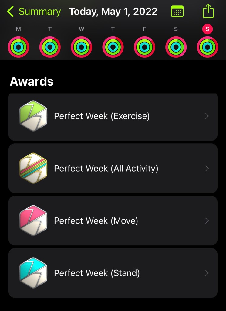 Another perfect week for all three activity rings. The best part is that I won’t have to stress about it while The Walking Dead is on tonight.