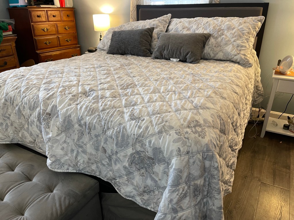 You can see the bed when I’m on conference calls at work, so I keep it neat looking. All nice and made up. Not like hospital corners neat, but nice enough.