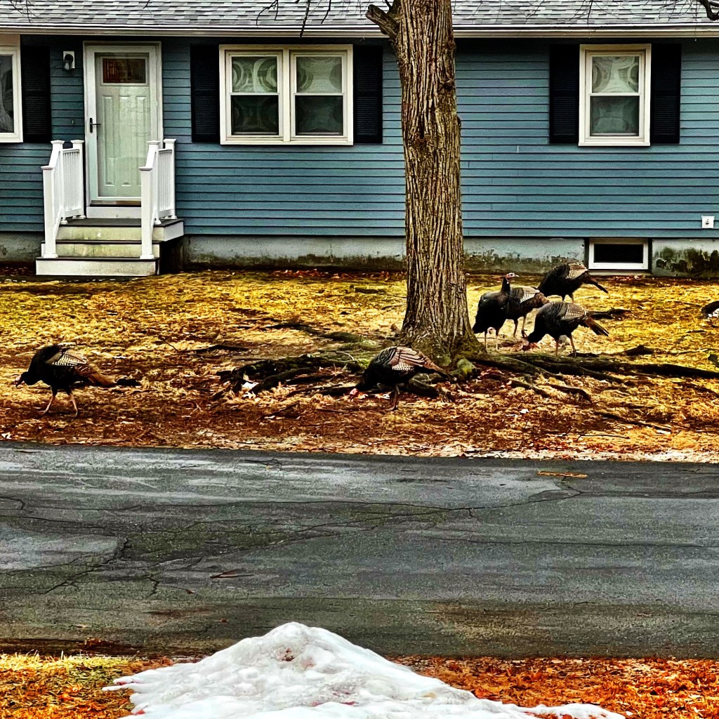 I got stuck in a traffic jam on a back road in Salem, NH tonight. There was a flock of wild turkeys crossing the street… single file… yeah, we were stopped there for a long time. There were at least 20 of them, but I couldn’t count them because they kept hiding behind the other stopped cars.